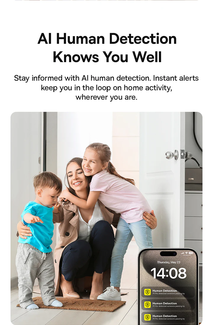 Smart AI Detection for Instant Alerts: Stay informed with intelligent AI functions that detect human presence, motion, sound, and even baby crying. Receive real-time alerts on your smartphone to keep track of any unusual activities.
