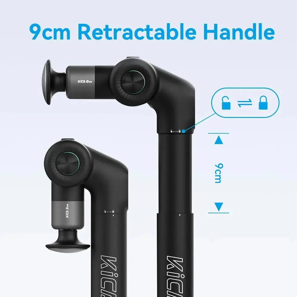 Kica Evo Massage Gun features a new, ergonomic design that allows flexible extension and contraction for easy self-use. After comprehensive refinements, it now offers a more human-centric structure with an L-shaped handle and a rotating arm adjustable from 0° to 113°. Equipped with 6 massage heads, it targets sore areas precisely and massages your back comfortably.
